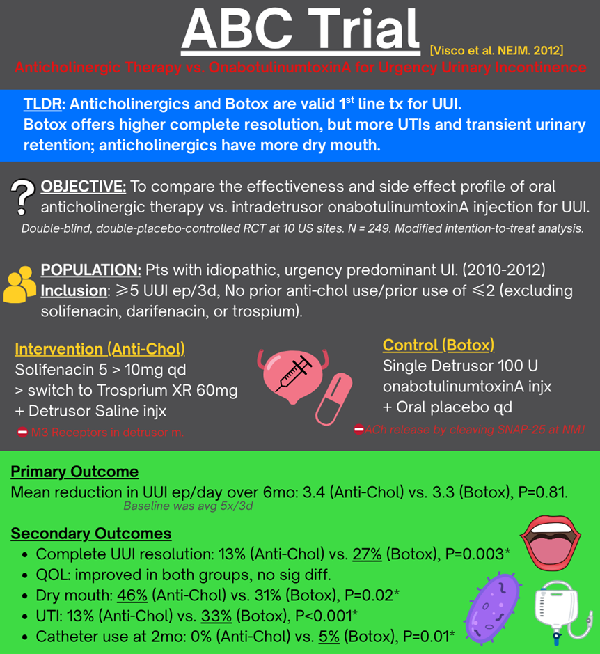 - If still not enough: Switch to PO Trospium XR 60mg qdComparison: Single 100U intradetrusor onabotulinumtoxinA (botox) injection.